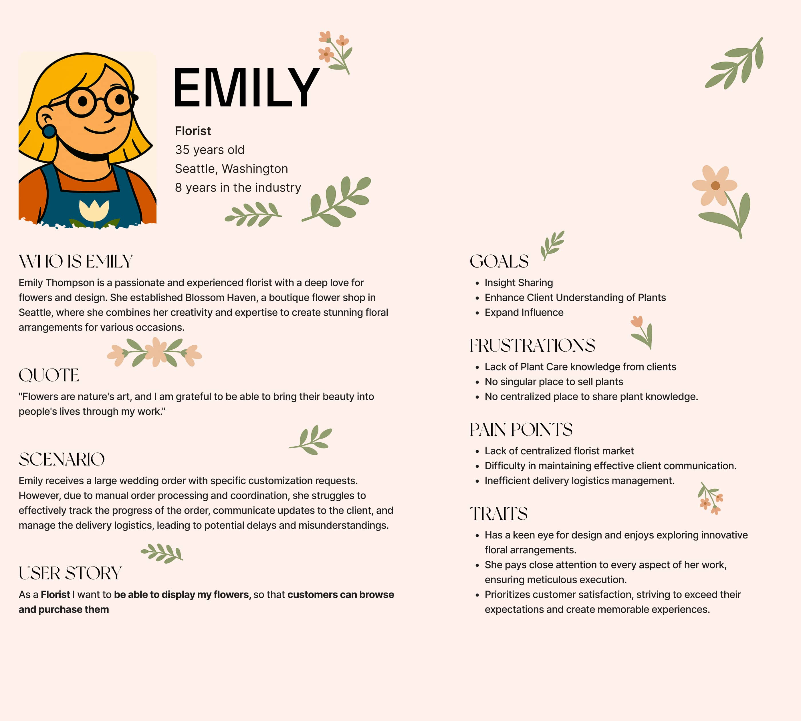 Naram: Okay, thank you for coming Emily, so as you know, I am building a florist ecosystem platform, but before I jump in, I need to understand what is needed to build it, your wants, needs, hopes and dreams, anything really. Let’s jump in…..
